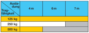 max. Tragfähigkeit in Abhängigkeit von der Ausladung